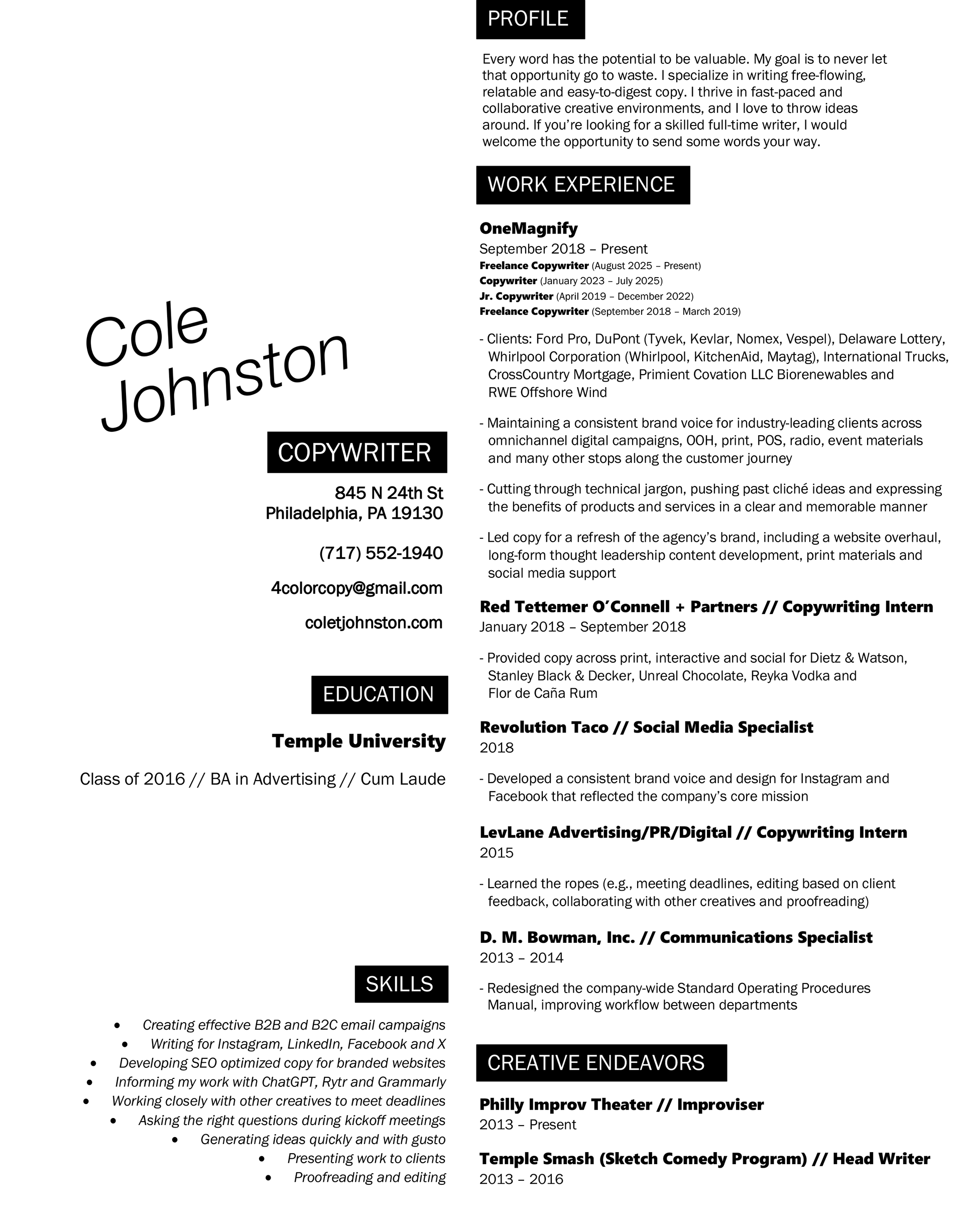 When it comes to writing, I'm thoughtful about every detail, eager to collaborate and endlessly curious. The same goes for when I'm not at my desk. Outside of the marketing/advertising world, I'm a songwriter, guitar player, avid thrifter, VHS collector, occasional crabber and amateur photographer. To really connect with people through writing, you have to get out there and talk to them. Try new things. Find new ways of looking at the world. That's why my list of hobbies is ever growing.